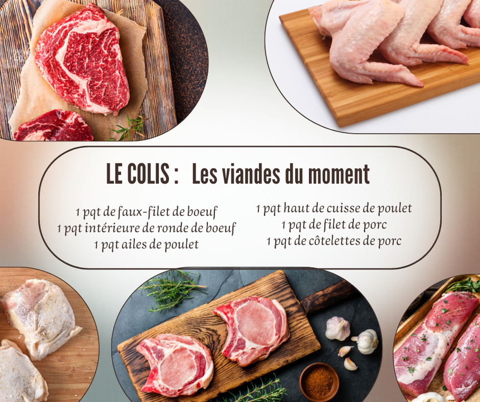 Voici le colis du moment en vigueur. La valeur de ce colis est de 100$ et vous payez 80$. Les paquets sont des portions pour 2 personnes.